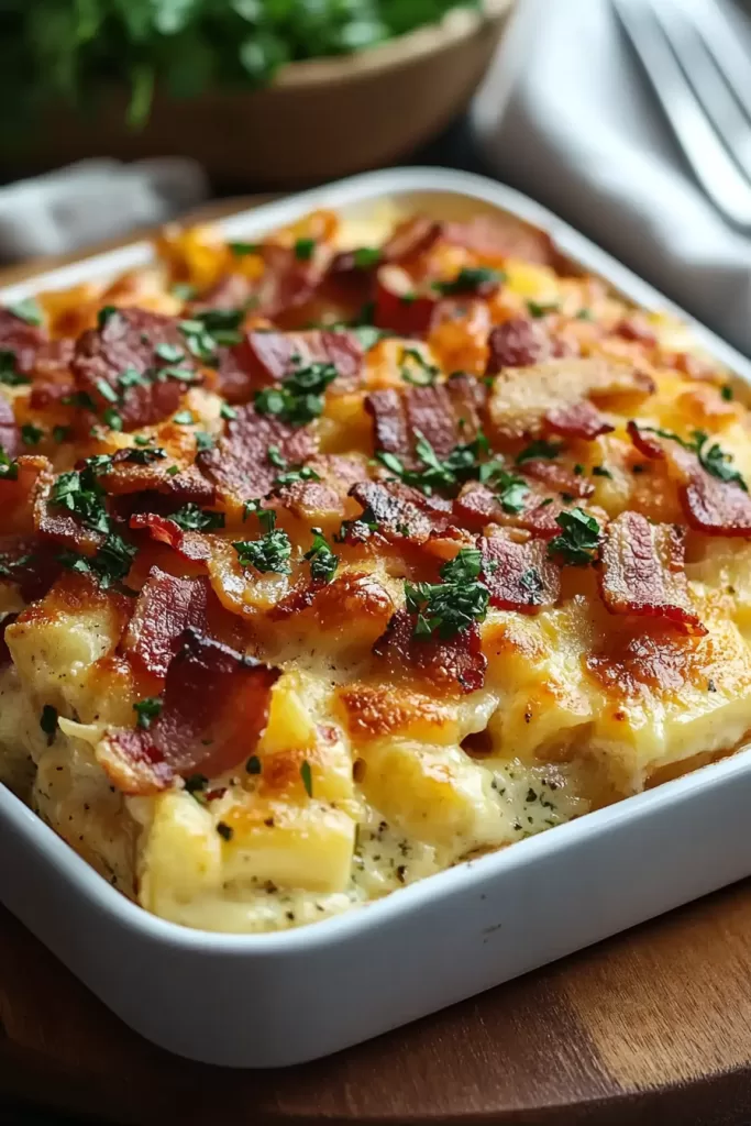 With its creamy ranch sauce, crispy bacon, and cheesy topping, this casserole is a surefire crowd-pleaser.